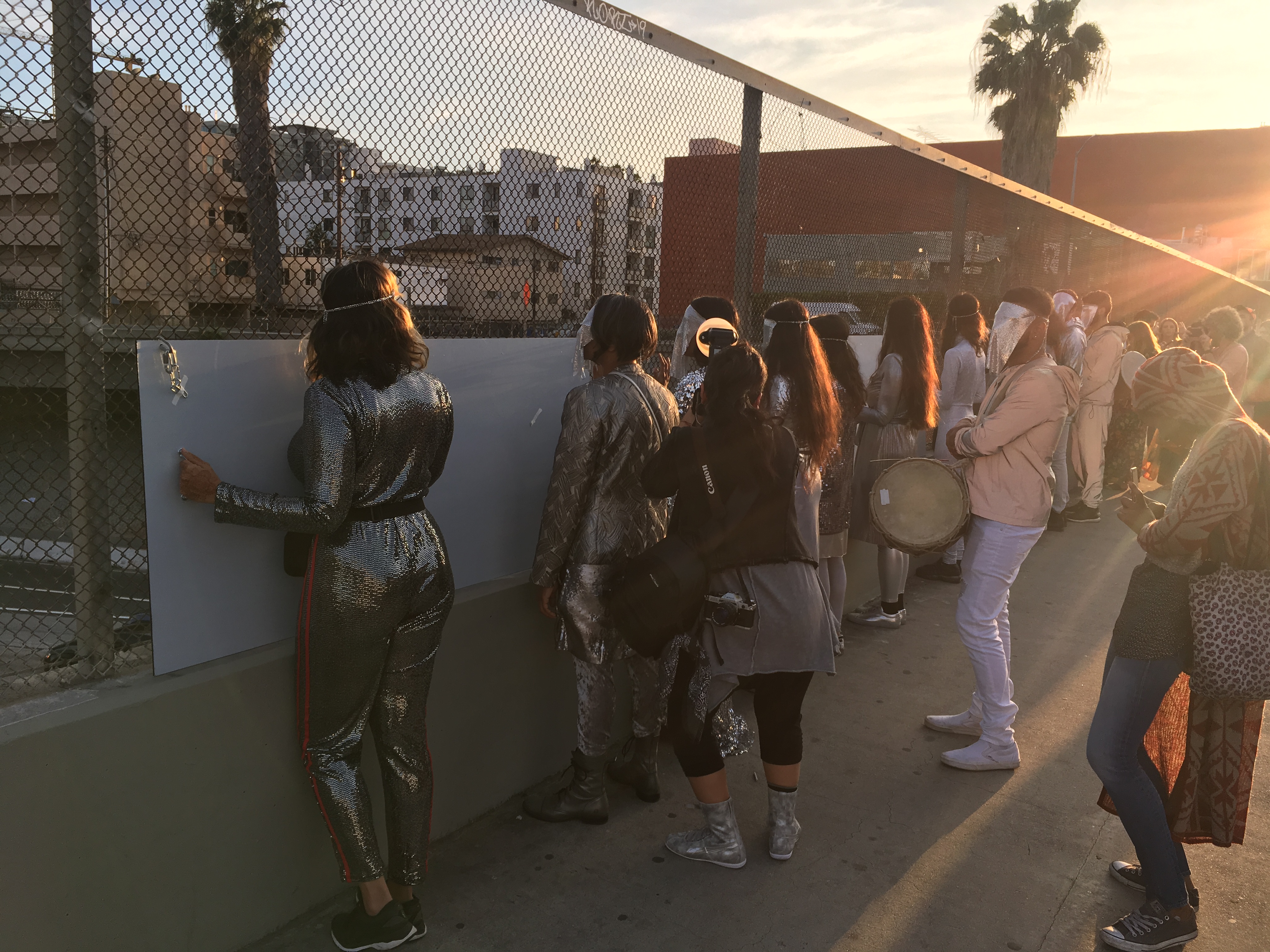Ajnabi Milan (Strangers' Union) is an intervention in the form of a surrealist/situationist procession of SWANA (South West Asia North Africa) diaspora with a message addressing alienation and inclusivity. The term alien refers to something unlike ourselves, whether a martian or a refugee. By emphasizing our alienness and our strangeness, we hope to leave a poetic impression and disruption on the every day in the unreal environment of Hollywood in Los Angeles though which we will be marching. We will begin at a freeway overpass with sequin signs that include a verse from the Bible, "I was a stranger and you welcomed me", spoken by Jesus to his disciples - an apt phrase and message of resistance in this moment in our political history of borders, walls, bans, and right wing exclusions. These signs will be printed in English and my native language Urdu, manufactured in a typical advertising process used in sequin billboards but subverting the usual message of consumption conveyed in this medium. Clothed in silver with silver face veils, we will march like a mirage of strangers from the freeway to the LACE gallery, where the signs will then be installed as the final phase of the performance. During the procession, we were accompanied by a live drummer playing percussive protest rhythms from South Asia. The performers included Amitis Motevalli, Anuradha Vikram, Azeem Khan, Asiya Mir, Hushidar Mortezaie, Khushboo Gulati, Maryam Hosseinzadeh, Perwana Nazif, Sasha Ali, and Shirin Guirguis. Music included selections by Discostan and sections of a mixtape by the Sand Ninja. Mask fabricated by Hushidar Mortezaie.